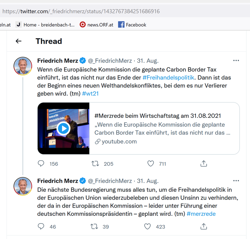 Merz tritt aggressiv gegen alle Vorhaben auf, den Welthandel auch nur ansatzweise ökologischer und sozialer zu gestalten. Der "Green New Deal", der EU-Kommission enthält nicht nur Blödsinn wie die Einstufung von Atomkraft und Gas als "grün". Er beinhaltet auch das Vorhaben einer "Carbon Border Tax". Diese würde den ökologischen Rucksack von Produkten bei der Einfuhr in die EU besteuerbar machen. Das wäre ein epochaler und längst überfälliger Schritt für eine Ökologisierung des weltweiten Handels. Friedrich Merz ist einer der schärfsten Kritiker dieses Vorhabens. Er nennt die Regelungsversuche „Unsinn“ und besteht auf der „Wiederbelebung“ der ökologisch und sozial ungeregelten alten „Freihandelspolitik der Europäischen Union“. So Merz am 31. 8. 2021 in seiner Rede am Wirtschaftstag der CDU und in Statements auf Twitter. Freier Handel, das mag in manchen unbedarften Ohren ja gut klingen. In Wahrheit aber ist es diesem „freien Handel“ egal, wie viel Umweltzerstörung, Kinderarbeit und Ausbeutung in den angeblich „frei“ gehandelten Produkten drinnen steckt.