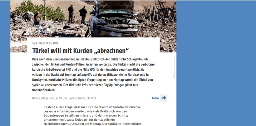Das Nato-Mitgliedsland Türkei exportiert sein ungelöstes Kurden“problem“ seit Jahren militärisch in die Nachbarstaaten Irak und Syrien. Jede Verhältnismäßigkeit zu möglicherweise (!) von KurdInnen verübten Terroranschlägen in der Türkei gehen dabei verloren.