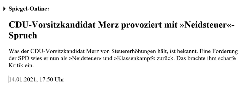 Kurz vor seiner Wahl zum CDU-Vorsitzenden positioniert sich Merz am 12. 1. in der ZDF-Sendung „Markus Lanz“ und auf Twitter noch einmal kräftig mit einem Stakkato neoliberaler Wortkeulen. Eine höhere Vermögenssteuer sei „reiner Klassenkampf“ oder nur eine „Neidsteuer auf höhere Einkommen“. Beiden Wortkeulen, „Neid“ und „Klassenkampf“, widme ich in meinem Buch „Achtung! Wortkeulen – Die Sprachtricks der Schlechtmenschen“ jeweils ein Kapitel.
