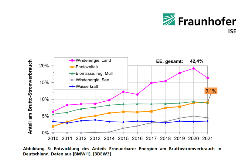 Das renommiert deutsche Fraunhofer Institut stellt in einer aktuellen Zusammenstellung aller relevanten Fakten rund um die Photovoltaik ebenfalls drastisch gesunkene Erzeugerpreise für Sonnenstrom und einen stetig steigenden Anteil der erneuerbaren Energien am Gesamtenergieverbrauch fest. Siehe Grafik. („Aktuelle Fakten zur Photovoltaik in Deutschland“, Harry Wirth, Fraunhofer ISE, 16.12.2021)