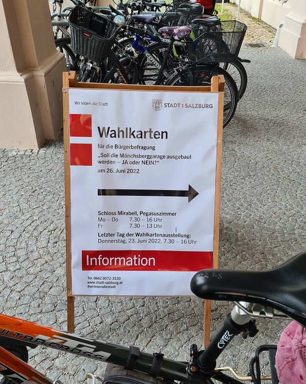 Ich unterschreibe den neuerlichen Anlauf für eine BürgerInnenbefragung zum Ausbau der Mönchsberggarage. Im Falle einer solchen Befragung würde ich mit Nein stimmen. Ich denke allerdings, dass man sowohl mit dem Baubeginn als auch mit einer vorherigen BürgerInnenbefragung zuwarten sollte, bis endgültig klar ist, ob und wann eine Salzburger Regionalstadtbahn mit einer Altstadt-Haltestelle gebaut wird.