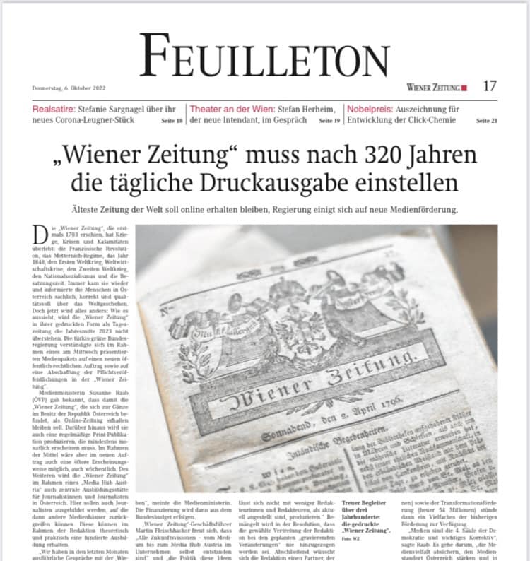 Die "Wiener Zeitung" soll als Tageszeitung im Eigentum der Republik Österreich erhalten bleiben. Mit einem starken Redaktionsstatut, mit Unabhängigkeit und Vielfalt, mit dem Mut zur Öffnung für die Zivilgesellschaft, als demokratische Medienplattform. Österreich kann und soll sich das leisten.